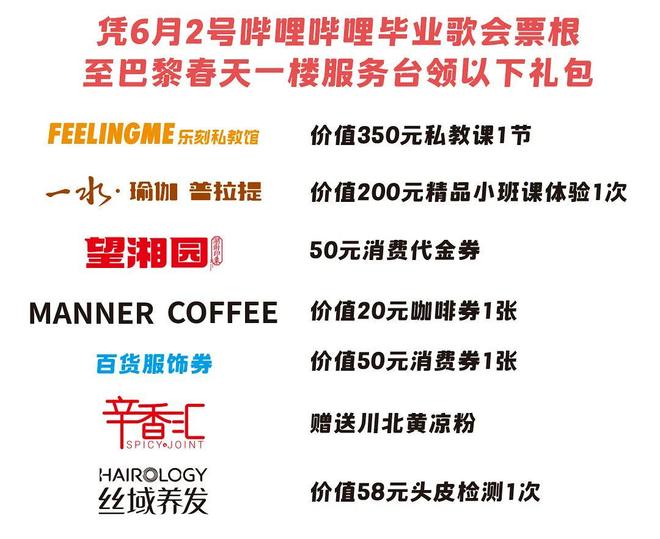 6月2日-6月8日,凭B站毕业歌会入场凭证取50元百货服饰券,5月31日-6月30日更多惊喜福利见下图。