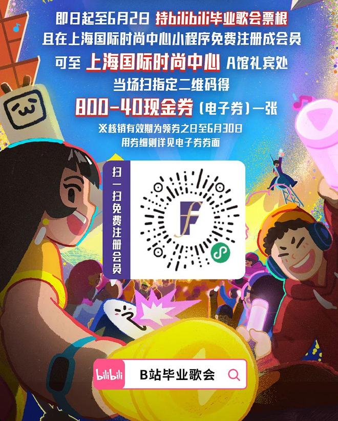 活动期间持B站毕业歌会入场凭证,且在上海国际时尚中心小程序免费注册成会员,可至上海国际时尚中心A馆礼宾处,当场扫指定二维码得800-40现金券(电子券)一张。核销有效期为领券之日至6月30日。用券细则详见电子券券面。