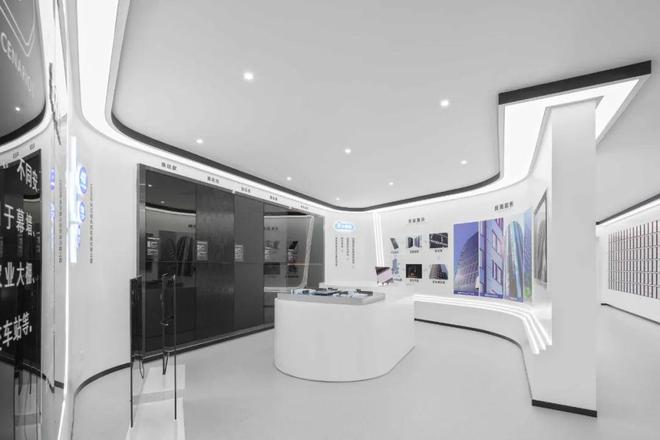 空间以白色为基调,黑色展板贴膜与顶部的天空元素共同构筑独具未来感与设计感的空间;展示墙的曲线造型及灯带令空间充满流动性,无形延伸了空间长度。