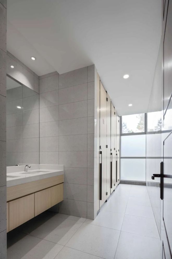 大厅是一个由纯白色包裹的开阔空间,正红色铝板由墙面延伸至天花,借助条形灯带拉伸视觉,沉稳大气。