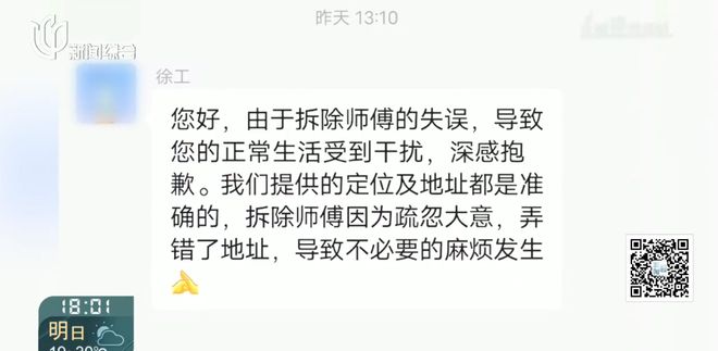 但根据徐某提供的他和工人余某的聊天记录显示,地址给到的确实是张女士家对面的301室。所以,徐某坚称问题不在他,但他愿意从中协商调解。