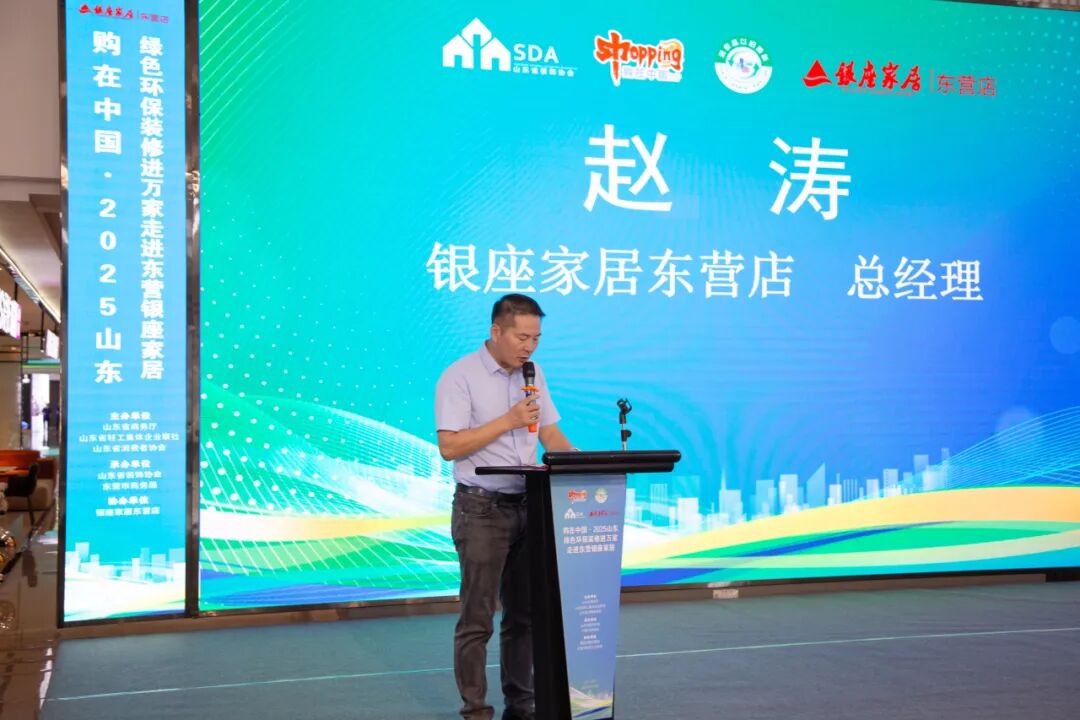 活动在热烈的掌声中正式拉开序幕。银座家居东营店总经理赵涛为本次活动致欢迎辞。他对活动的举办表达了诚挚祝贺,并对各位领导和嘉宾的莅临表示热烈欢迎。他表示,银座家居积极响应国家号召,始终将绿色环保视为企业生命线,多措并举严控品质,保障消费者能够买到“绿色环保、品质出众”的优质产品。