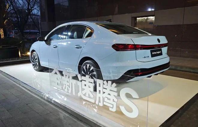 外观上,全新速腾S新车使用全新设计,整体变得更加前卫,引擎盖处有多条筋线,前大灯组整体较为犀利,内部为LED光源,中央配备贯穿式灯带,下梯形进气格栅,前唇比较扁平,在燃油车领域,整体看上去较为动感。